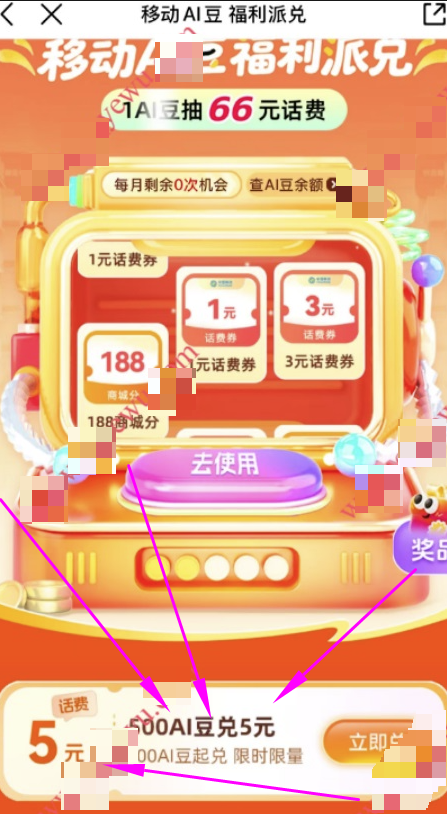 和包AI豆福利派兑抽0.1-66元话费券+兑5元话费,限移动用户参与。